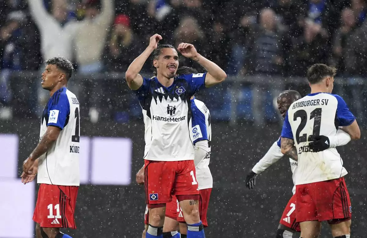 Hamburger's Jean-Luc Dompé, right, celebrates scoring with Luka Vusskovic during the Bundesliga soccer match between Hamburger SV and FSV Mainz 05 at the Volksparkstadion, Hamburg, Germany, Sunday Oct. 5, 2025. (Marcus Brandt/dpa via AP)