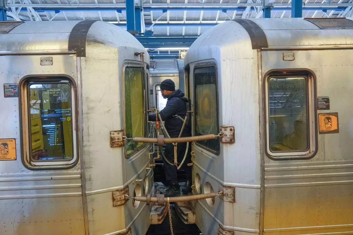 FILE - A train conductor walks between subway cars at a station in the Coney Island section of New York, Thursday, Jan. 23, 2025. (AP Photo/Seth Wenig, File)