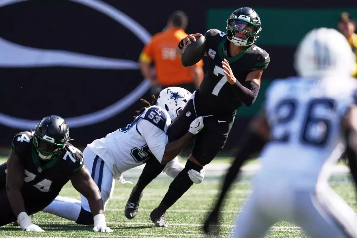 Dallas Cowboys' James Houston sacks New York Jets' Justin Fields during the first half of an NFL football game Sunday, Oct. 5, 2025, in East Rutherford, N.J. (AP Photo/Seth Wenig)