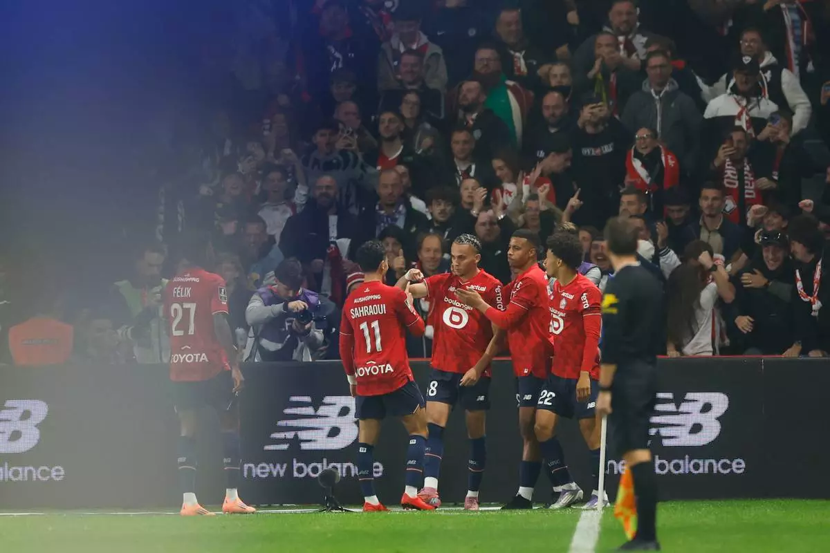 Lille's Ethan Mbappe, centre, celebrates with teammates after scoring his side's opening goal during the French League One soccer match between Lille and Paris Saint-Germain at the Stade Pierre-Mauroy in Villeneuve-d'Ascq, outside Lille, France, Sunday, Oct. 5, 2025. (AP Photo/Jean-Francois Badias)