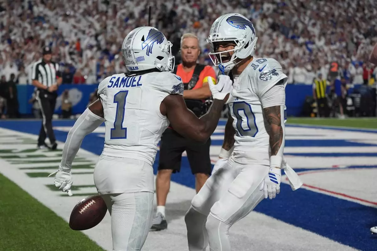 Buffalo Bills wide receiver Curtis Samuel (1) celebrates his touchdown catch with teammates Khalil Shakir (10) during the second half of an NFL football game against the New England Patriots, Sunday, Sept. 5, 2025, in Orchard Park, N.Y. (AP Photo/Gene J. Puskar)