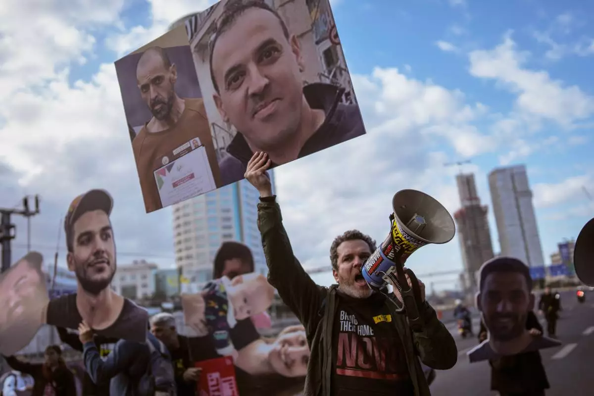FILE - A demonstrator wave photos of freed Israeli hostage Eli Sharabi before and after his captivity blocks a highway during a protest demanding all hostages release from Hamas captivity, in Tel Aviv, Israel, Thursday, Feb. 13, 2025. (AP Photo/Oded Balilty, File)