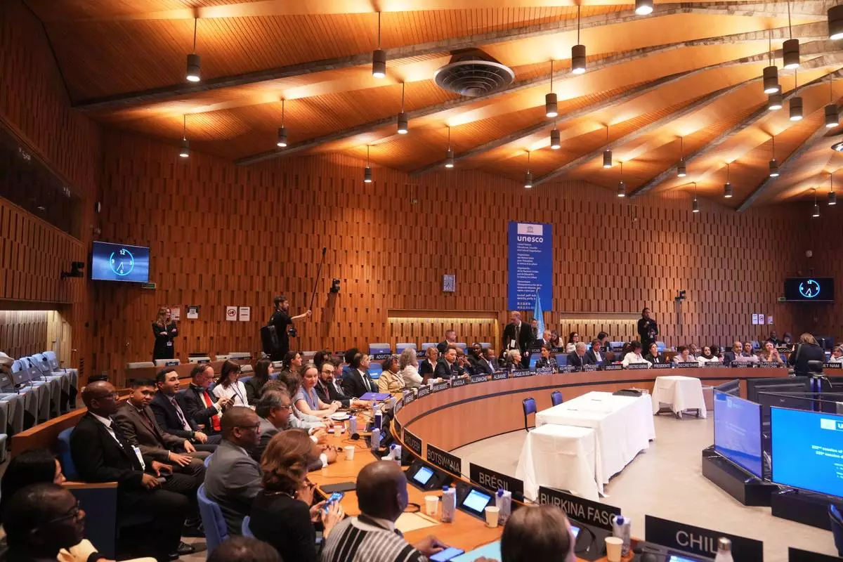 Members of the UNESCO executive board gather to elect their new Secretary General, at the UNESCO headquarters in Paris, Monday, Oct. 6, 2025. (Thibault Camus)