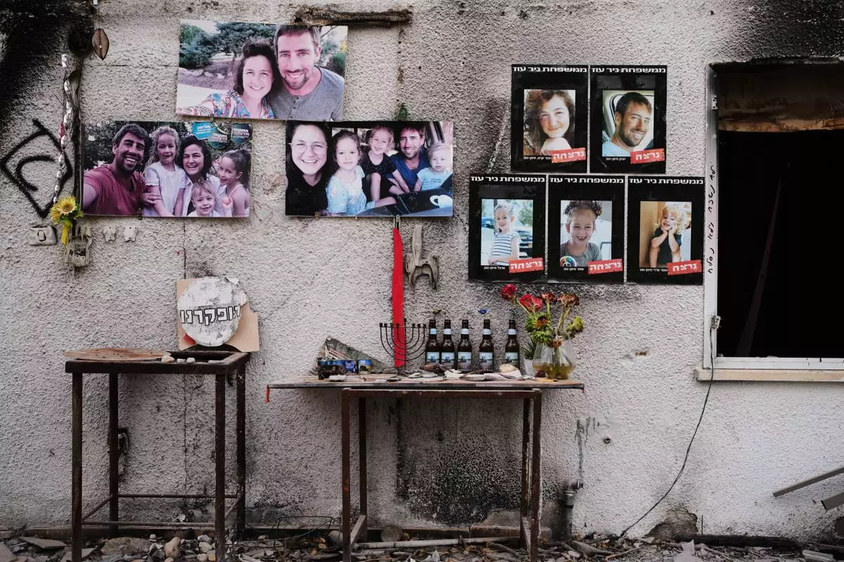Photos of the Siman Tov family are plastered on their burnt house where all five of them were killed during the Hamas attack on Oct. 7, 2023, in Kibbutz Nir Oz, Israel, a day before Israel marks the two-year anniversary of the attack, Monday, Oct. 6, 2025. (AP Photo/Ohad Zwigenberg)