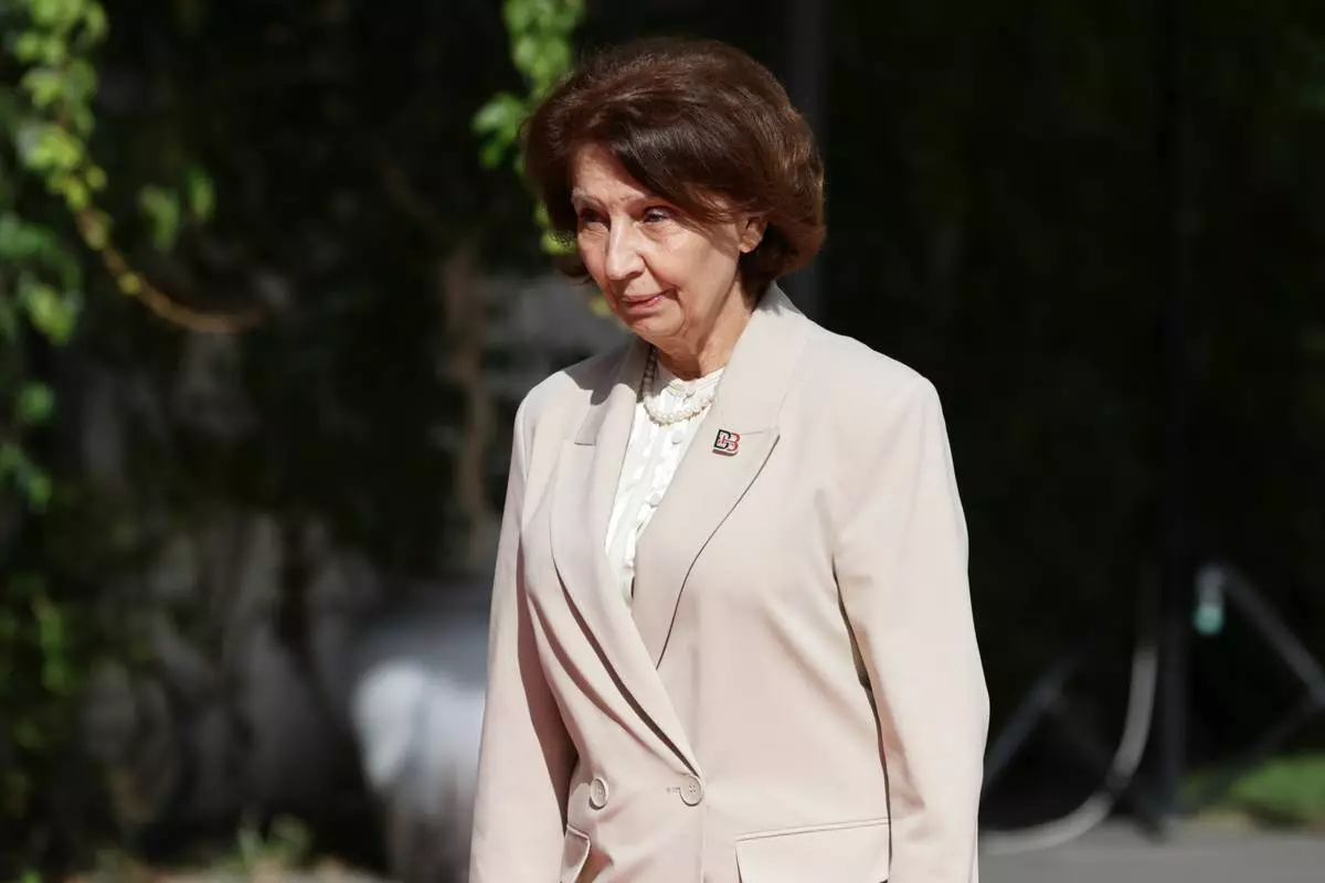 North Macedonia President Gordana Siljanovska-Davkova arrives at the Brdo-Brijuni, Process Leaders' Meeting in Golem, Albania, 50 kilometers (30 miles) west of the capital, Tirana , Albania on Monday, Oct. 6, 2025 .(AP Photo/Vlasov Sulaj)