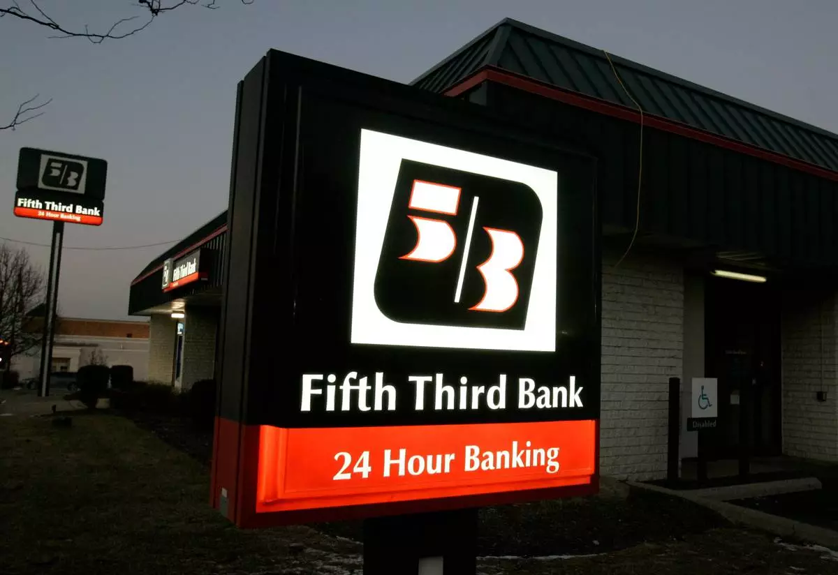 FILE - In this Jan. 21, 2009 file photo, signs outside a Fifth Third Bank are lit up at dusk in Cincinnati.(AP Photo/Al Behrman, file)