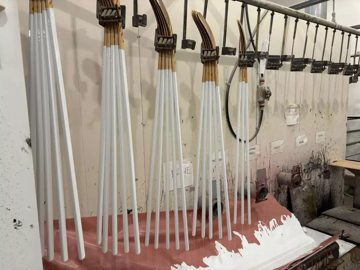 At one workstation, a worker uses liquid epoxy to glue fiberglass reinforcing sheets to wooden blades, in batches of six. Nearby, another worker uses a band saw to trim dried excess fiberglass off each blade. In the paint room, sticks are dipped in white paint and then hung on a line of moving hooks to dry.