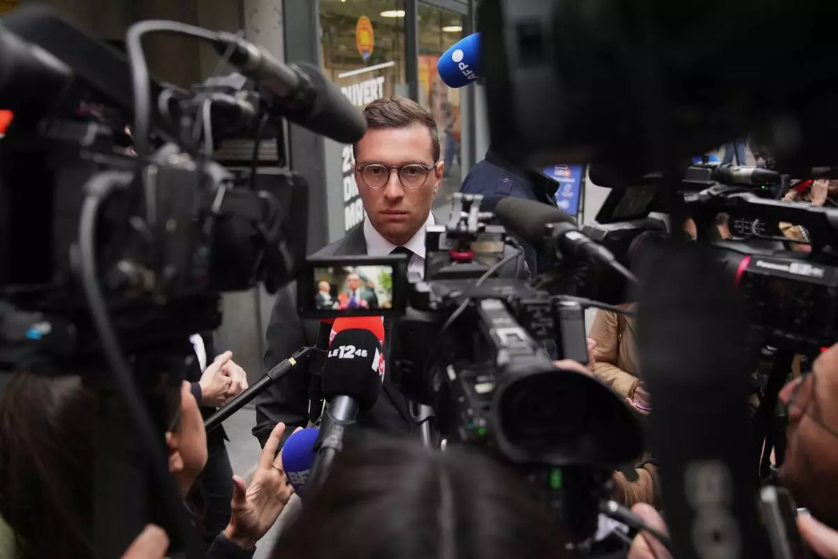 French far right National Rally party president Jordan Bardella answers reporters following a meeting, after France's prime minister Sebastien Lecornu resigned plunging the country into a deep political crisis. Monday, Oct. 6, 2025 in Paris. (AP Photo/Christophe Ena)