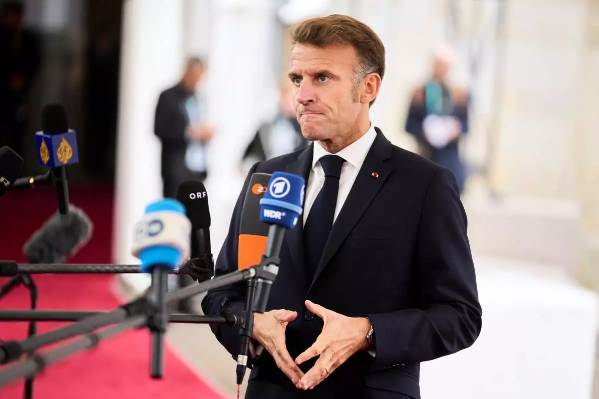 French President Emmanuel Macron arrives at an informal summit in the Danish parliament at Christiansborg Castle in Copenhagen, Wednesday, Oct. 1, 2025. (Thomas Traasdahl/Ritzau Scanpix via AP)