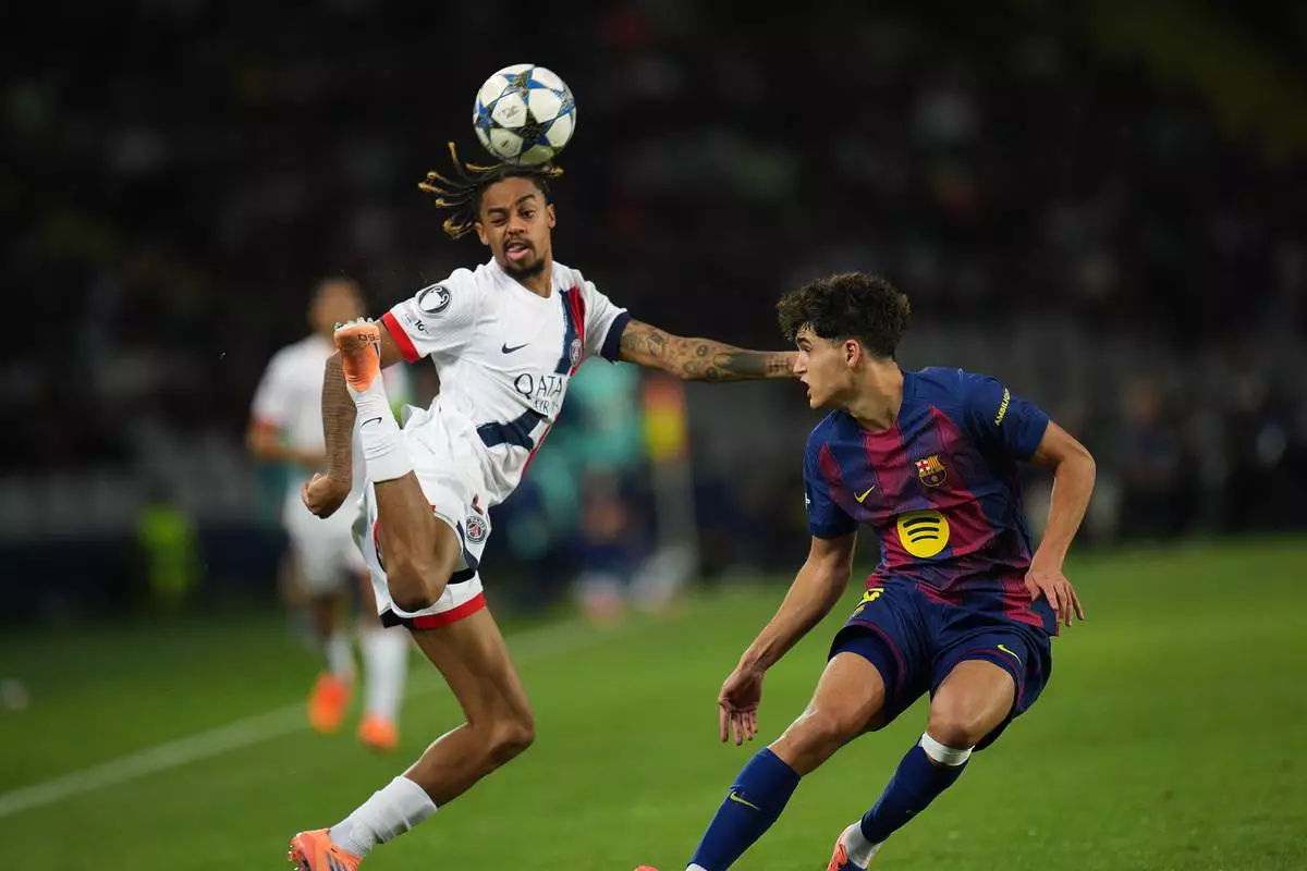 PSG's Bradley Barcola, left, challenges for the ball with Barcelona's Pau Cubarsi during the Champions League opening phase soccer match between Barcelona and Paris Saint-Germain at the Lluis Companys Olympic Stadium in Barcelona, Spain, Wednesday, Oct.1, 2025. (AP Photo/Emilio Morenatti)