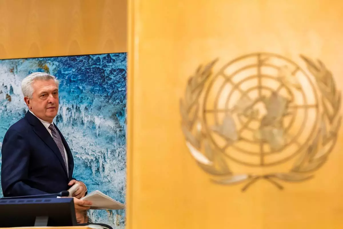 Filippo Grandi, UN High Commissioner for Refugees (UNHCR), attends UNHCR's 76th annual Executive Committee meeting at the European headquarters of the United Nations in Geneva, Switzerland, Monday, Oct. 6, 2025. (Salvatore Di Nolfi/Keystone via AP)