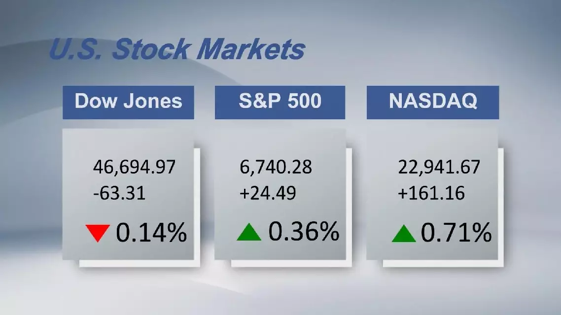 The Dow Jones Industrial Average fell 63.31 points, or 0.14 percent, to 46,694.97. The Standard and Poor's 500 rose 24.49 points, or 0.36 percent, to 6,740.28. The Nasdaq Composite Index gained 161.16 points, or 0.71 percent, to 22,941.67, closing at a fresh record high.
