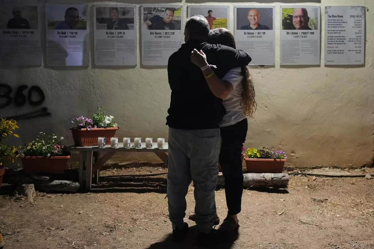 People attend a memorial service marking two years since the Oct. 7, 2023, Hamas cross-border attack on Israel, in Kibbutz Kfar Aza, southern Israel where many of its community members were Killed and abducted, Tuesday, Oct. 7, 2025. (AP Photo/Ohad Zwigenberg)