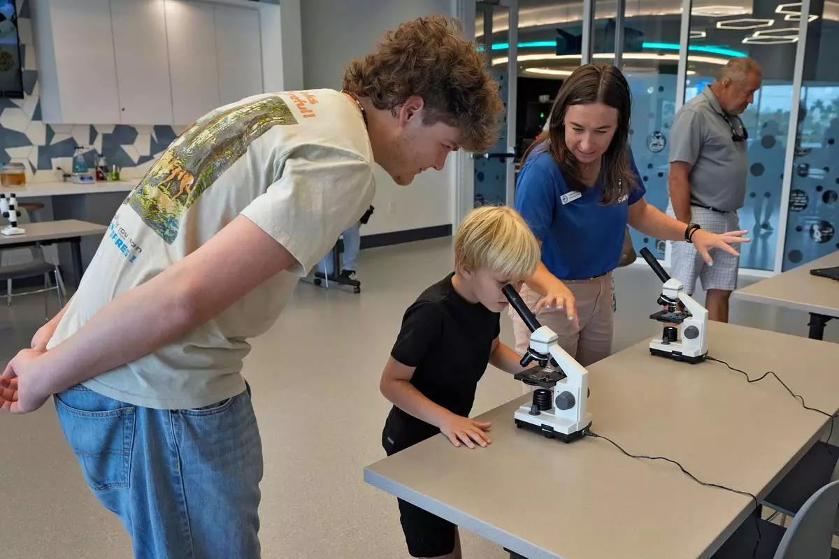 Staff member Amanda Shuman, second from right, instructs visitors using microscopes in the biomedical and immunology teaching laboratory at the Mote Science Education Aquarium, Monday, Oct. 6, 2025, in Sarasota, Fla. (AP Photo/Chris O'Meara)