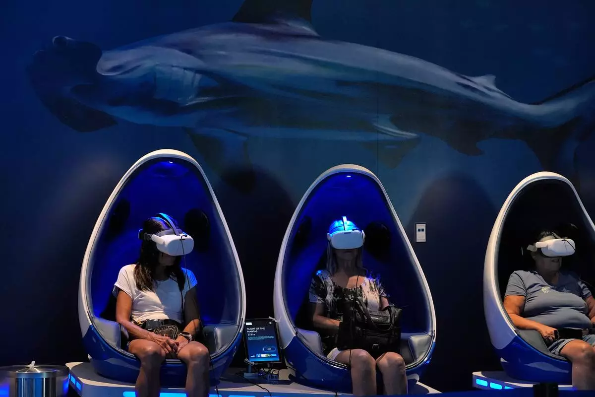 Visitors use virtual reality glasses at the Mote Science Education Aquarium, Monday, Oct. 6, 2025, in Sarasota, Fla. (AP Photo/Chris O'Meara)