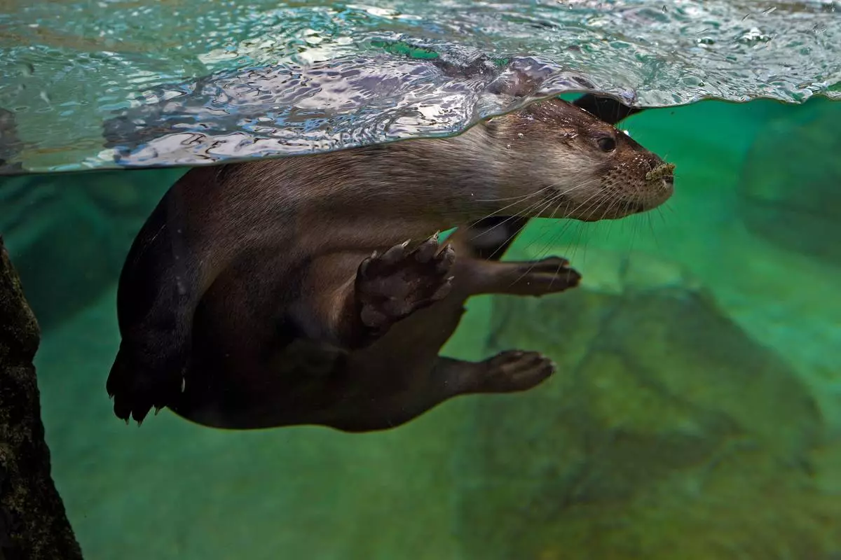 A river otter plays in the water in their tank at the Mote Science Education Aquarium, Monday, Oct. 6, 2025, in Sarasota, Fla. (AP Photo/Chris O'Meara)