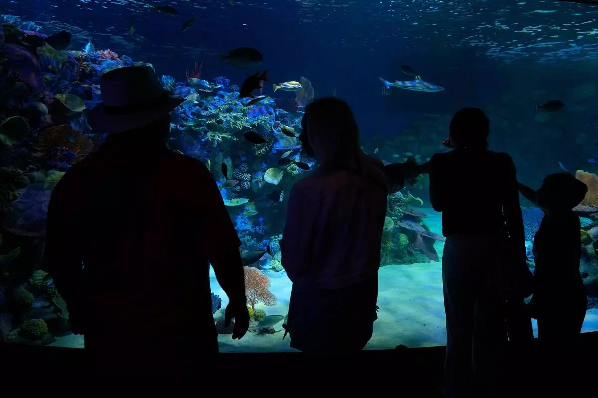 Visitors watch fish swim in a replica of an Indo-Pacific reef at the Mote Science Education Aquarium Monday, Oct. 6, 2025, in Sarasota, Fla. (AP Photo/Chris O'Meara)