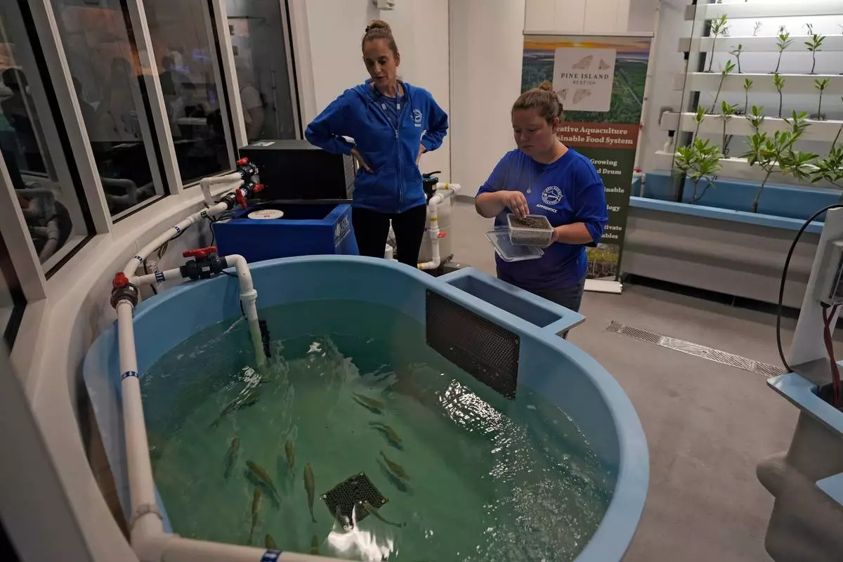 Staff members feed juvenile fish at the Mote Science Education Aquarium, Monday, Oct. 6, 2025, in Sarasota, Fla. (AP Photo/Chris O'Meara)