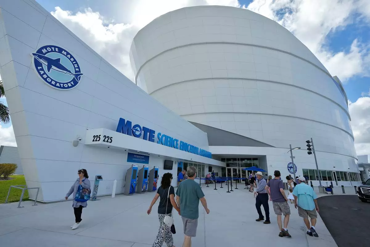Guests arrive at the Mote Science Education Aquarium for a soft opening, Monday, Oct. 6, 2025, in Sarasota, Fla. (AP Photo/Chris O'Meara)