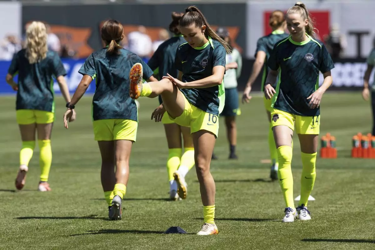 Washington Spirit midfielder Courtney Brown warms up before a NWSL soccer match against Bay FC on Saturday, Aug. 23, 2025, in San Francisco. (AP Photo/Benjamin Fanjoy)