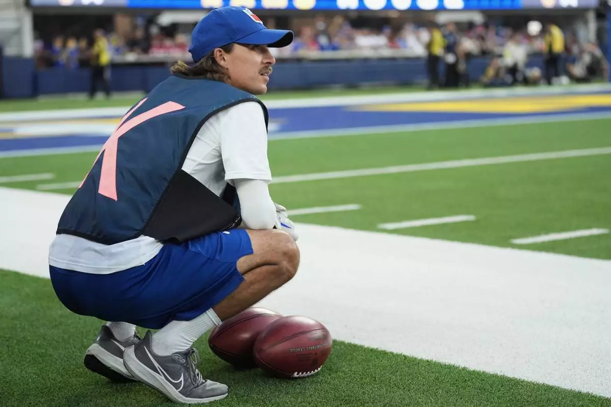 Special footballs used for kicks and punts are held by a ball crew member during the first half of an NFL football game between the Los Angeles Rams and the San Francisco 49ers, Thursday, Oct. 2, 2025, in Inglewood, Calif. (AP Photo/Marcio Jose Sanchez)