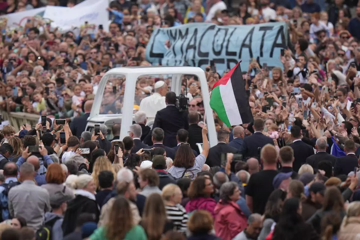 Pope Leo XIV rides on his popemobile next to a Palestinian flag at the end of a Mass for the Jubilee of Migrants and Missionaries in St. Peter's Square at the Vatican, Sunday, Oct. 5, 2025. (AP Photo/Alessandra Tarantino)