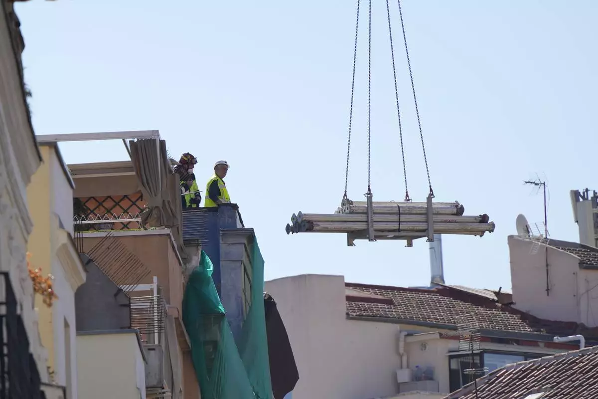 Emergency personnel respond to the scene of a building collapse in Madrid, Spain, on Tuesday, Oct. 7, 2025. (AP Photo/Manu Fernandez)