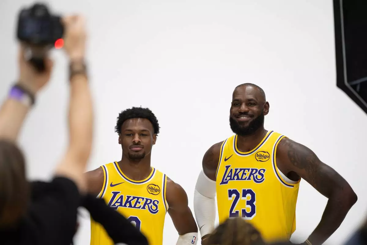 Los Angeles Lakers' LeBron James (23) and Bronny James (9) pose for photos during the NBA basketball team's media day in El Segundo, Calif., Monday, Sept. 29, 2025. (AP Photo/Jae C. Hong)