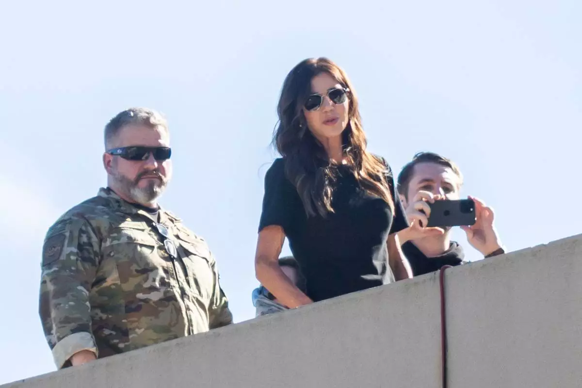 U.S. Secretary of Homeland Security Kristi Noem, center, stands on the roof of a U.S. Immigration and Customs Enforcement facility in Portland, Ore., Tuesday, Oct. 7, 2025. (AP Photo/Ethan Swope)