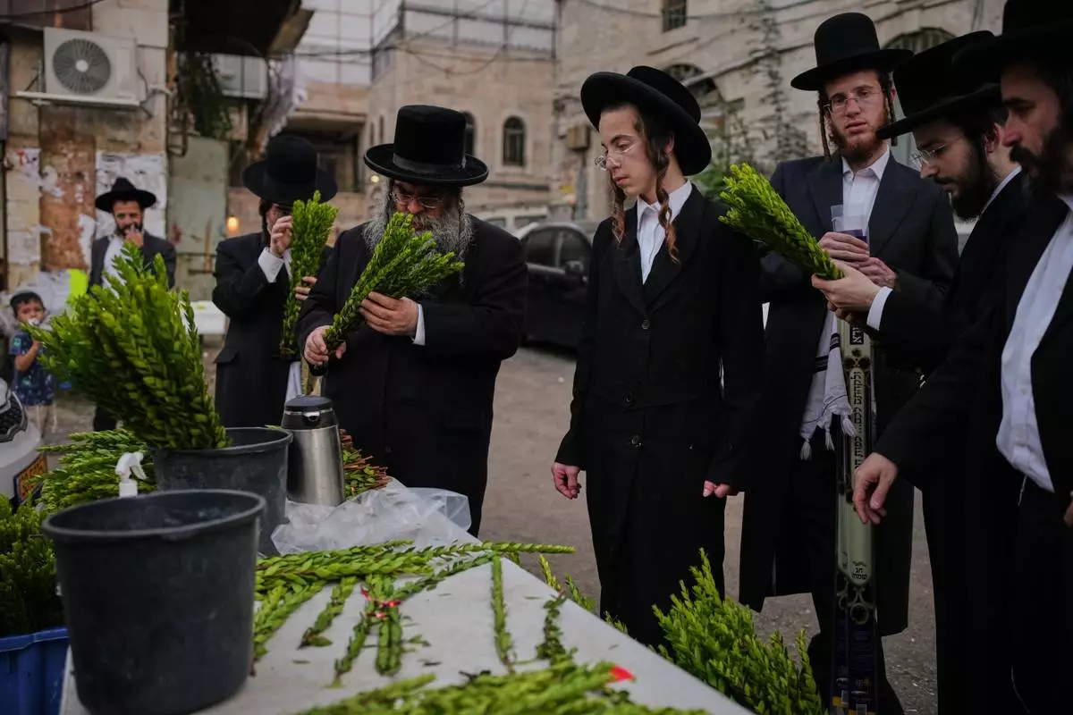 Ultra-Orthodox Jewish men inspect myrtle branches to determine if it is ritually acceptable as one of the four items used as a symbol on the upcoming Jewish holiday of Sukkot, in Jerusalem's Mea Shearim neighborhood, Sunday, Oct. 5, 2025. (AP Photo/Ohad Zwigenberg)