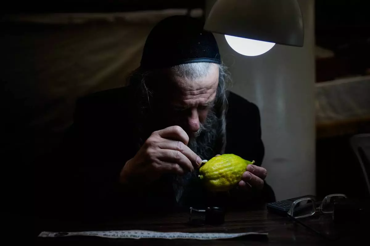 An ultra-Orthodox Jewish man inspects an etrog, a citrus fruit, to determine if it is ritually acceptable as one of the four items used as a symbol on the upcoming Jewish holiday of Sukkot, in Jerusalem's Mea Shearim neighborhood, Sunday, Oct. 5, 2025. (AP Photo/Ohad Zwigenberg)