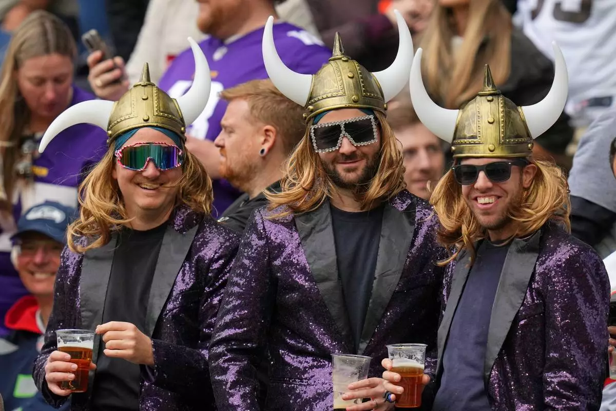 Vikings supporters wait for the start of the NFL game between Minnesota Vikings and Cleveland Browns at the Tottenham Hotspur stadium in London, Sunday, Oct. 5, 2025. (AP Photo/Kirsty Wigglesworth)