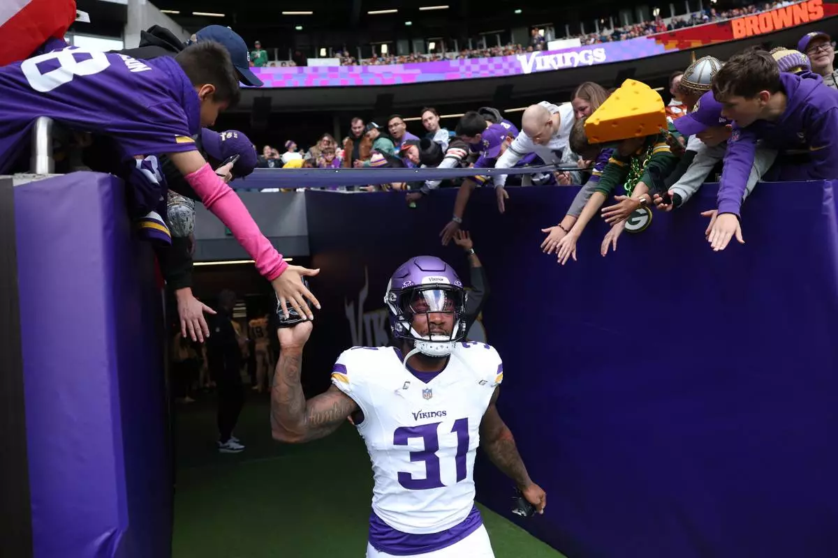 Minnesota Vikings running back Cam Akers runs onto the field for the warm-up ahead of the NFL game between Minnesota Vikings and Cleveland Browns at the Tottenham Hotspur stadium in London, Sunday, Oct. 5, 2025. (AP Photo/Ian Walton)