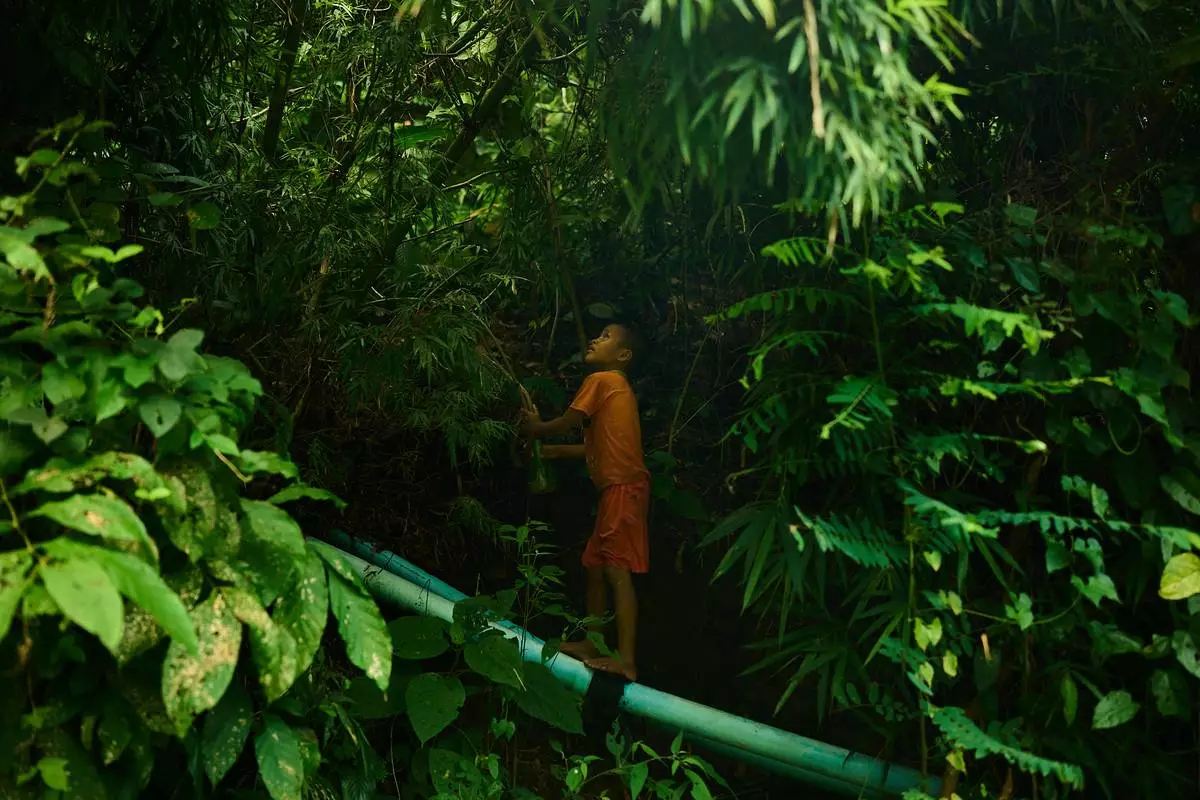 A child refugee from Myanmar stands on a water pipe while foraging for food in a forest near the Mae La refugee camp in the Tak province of Thailand, Thursday, Aug. 28, 2025. (AP Photo/Bram Janssen)