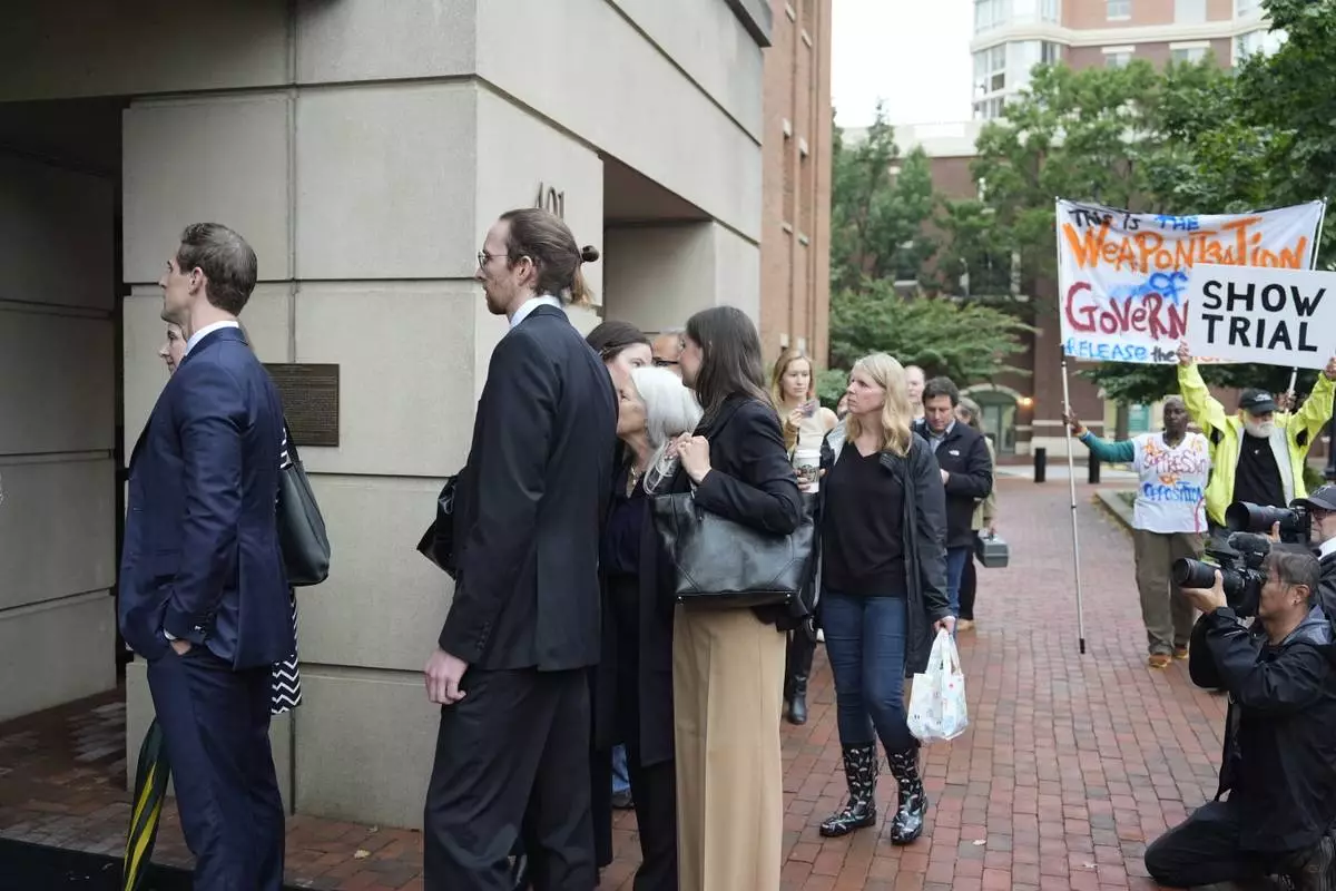 Family of former FBI Director James Comey and others, arrive at federal court in Alexandria, Va., Wednesday, Oct. 8, 2025. (AP Photo/Alex Brandon)