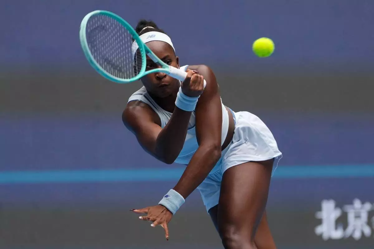 Coco Gauff of the United States returns a shot from compatriot Amanda Anisimova in a women's singles semifinal match of the China Open tennis tournament in Beijing, China, Saturday, Oct. 4, 2025.(AP Photo/Ng Han Guan)