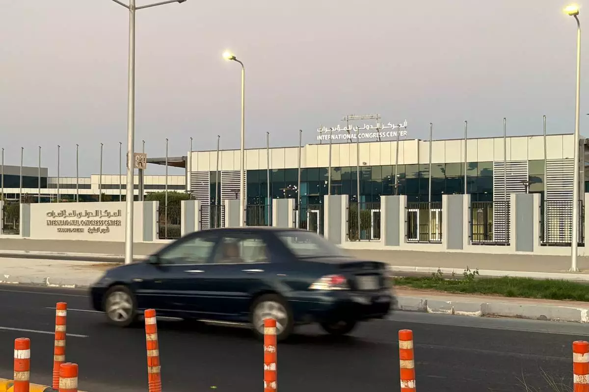 A vehicle passes in front of the International Conference Center where Israeli and Hamas officials are set to hold indirect talks Wednesday, Oct. 8, 2025. (AP Photo)
