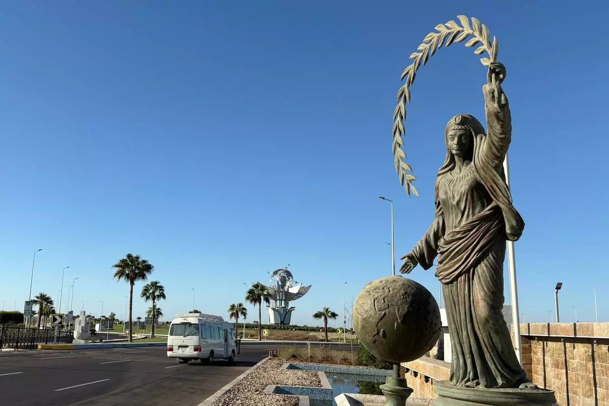 A vehicle passes at Peace Square at the Red Sea city of Sharm el-Sheikh, Egypt, where Israeli and Hamas officials are set to hold indirect talks, Wednesday, Oct. 8, 2025. (AP Photo)