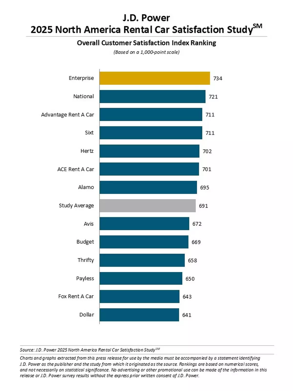 Enterprise ranks highest in overall customer satisfaction with a score of 734. National (721) ranks second. Advantage Rent A Car and Sixt rank third in a tie, each with a score of 711.