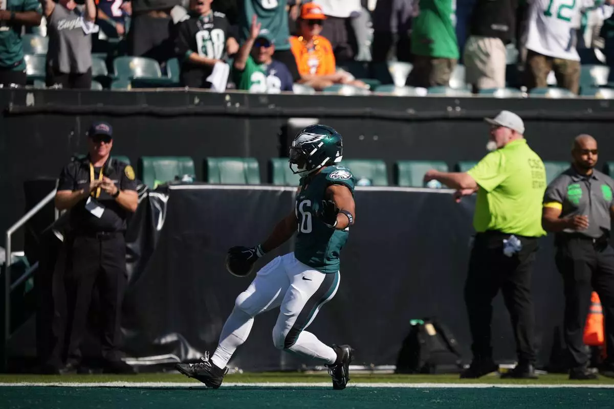 Philadelphia Eagles running back Saquon Barkley scores a touchdown during the second half of an NFL football game against the Denver Broncos on Sunday, Oct. 5, 2025, in Philadelphia. (AP Photo/Matt Slocum)