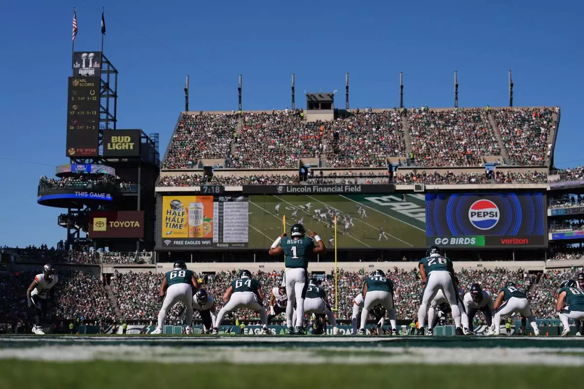 Philadelphia Eagles quarterback Jalen Hurts (1) signals during the second half of an NFL football game against the Denver Broncos on Sunday, Oct. 5, 2025, in Philadelphia. (AP Photo/Matt Slocum)