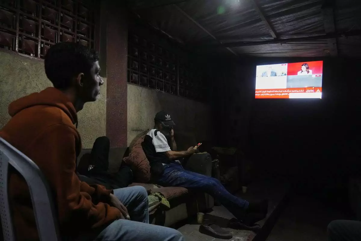 Palestinians follow the news on a television after the announcement that Israel and Hamas have agreed to the first phase of a peace plan to pause fighting, as they sit in a tent outside Al-Aqsa Hospital, in Deir al-Balah, in the central Gaza Strip, Thursday, Oct. 9, 2025. (AP Photo/Abdel Kareem Hana)