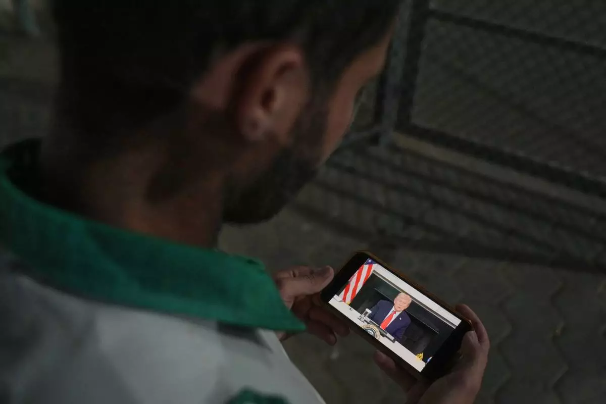 Palestinian paramedic Saeed Awad looks at his phone displaying an image of U.S. President Donald Trump, following the announcement that Israel and Hamas have agreed to the first phase of a peace plan to pause fighting, as he stands at Al-Aqsa Hospital, in Deir al-Balah, in the central Gaza Strip, Thursday, Oct. 9, 2025. (AP Photo/Abdel Kareem Hana)
