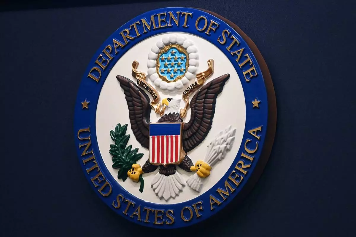 FILE - The State Department seal is seen on the briefing room lectern at the State Department in Washington, Jan. 31, 2022. (Mandel Ngan, Pool via AP, File)