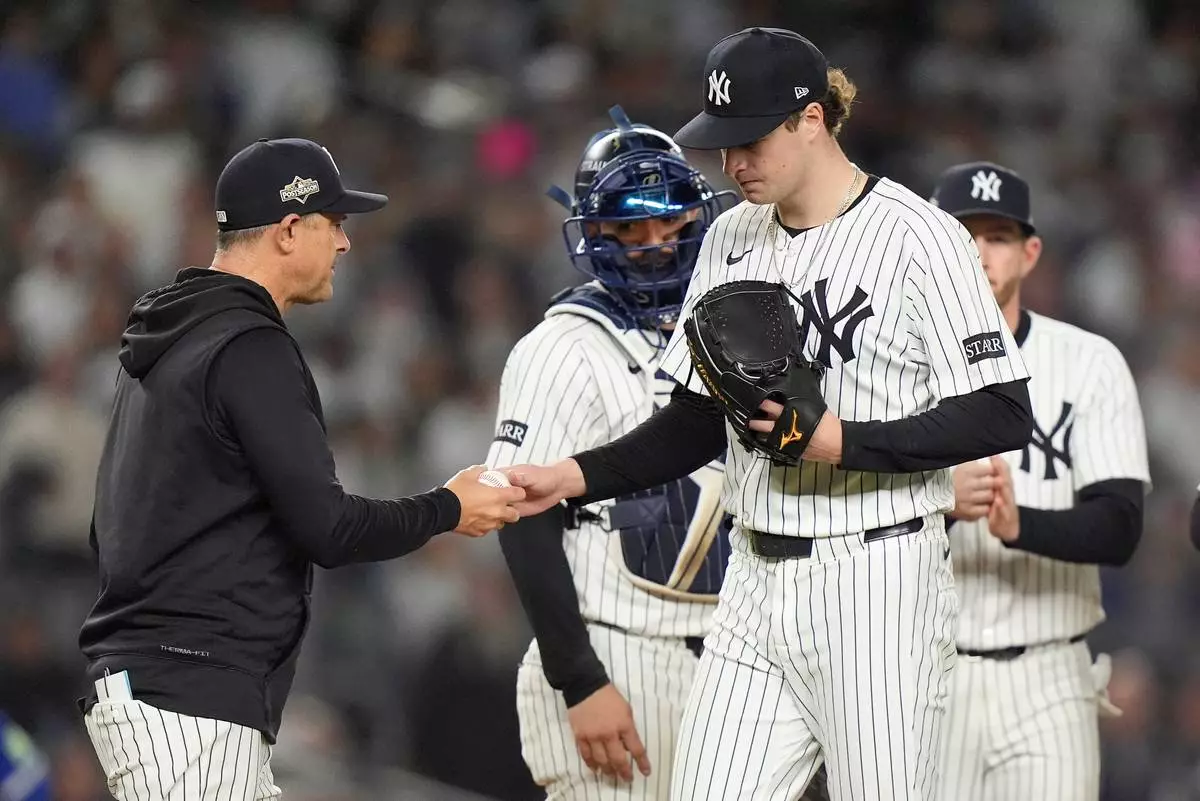 New York Yankees pitcher Cam Schlittler hands the ball to manager Aaron Boone as he leaves the game during the seventh inning of Game 4 of baseball's American League Division Series against the Toronto Blue Jays, Wednesday, Oct. 8, 2025, in New York. (AP Photo/Frank Franklin II)