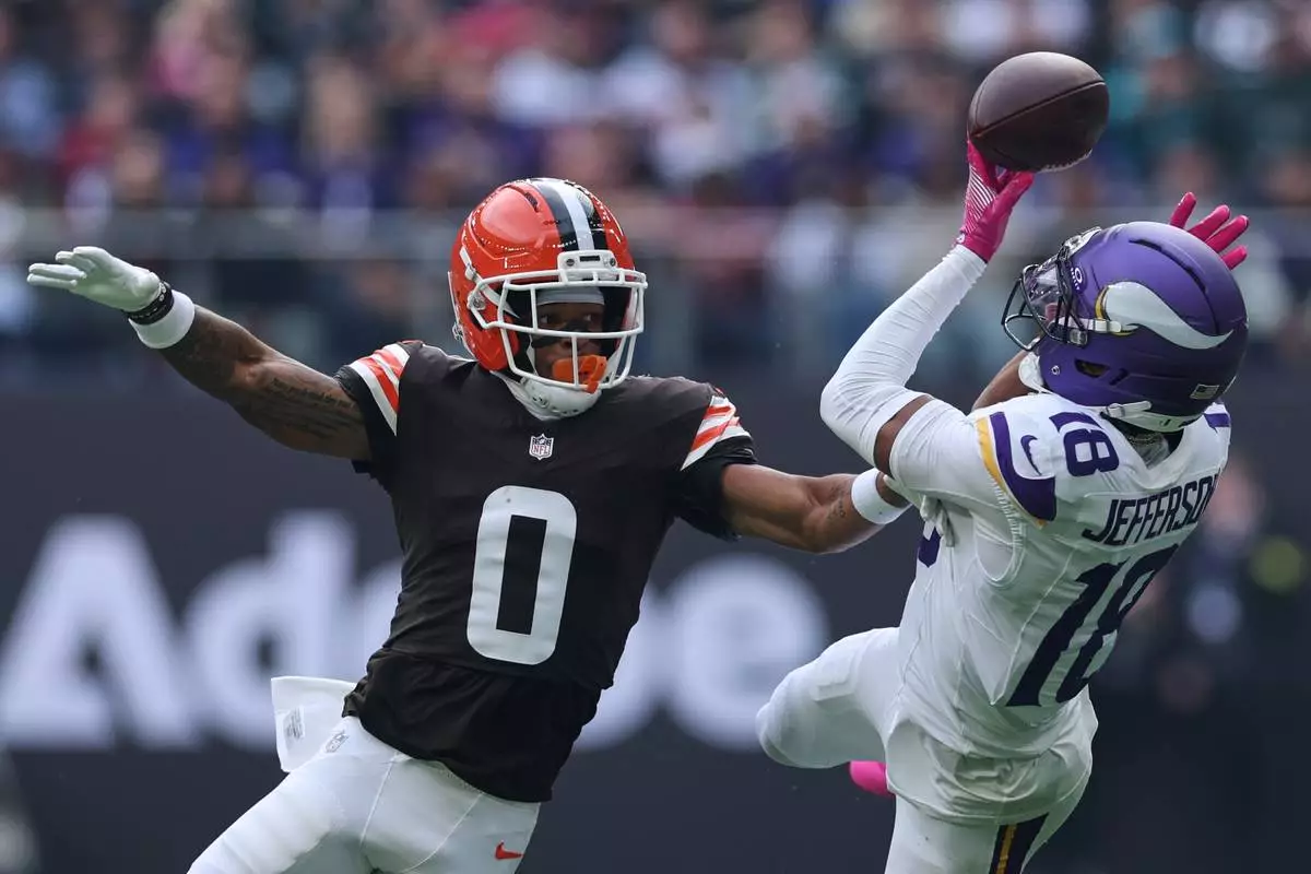 Minnesota Vikings wide receiver Justin Jefferson (18) fails to catch the ball as Cleveland Browns Greg Newsome II challenges during the first half of the NFL game between Minnesota Vikings and Cleveland Browns at the Tottenham Hotspur stadium in London, Sunday, Oct. 5, 2025. (AP Photo/Ian Walton)