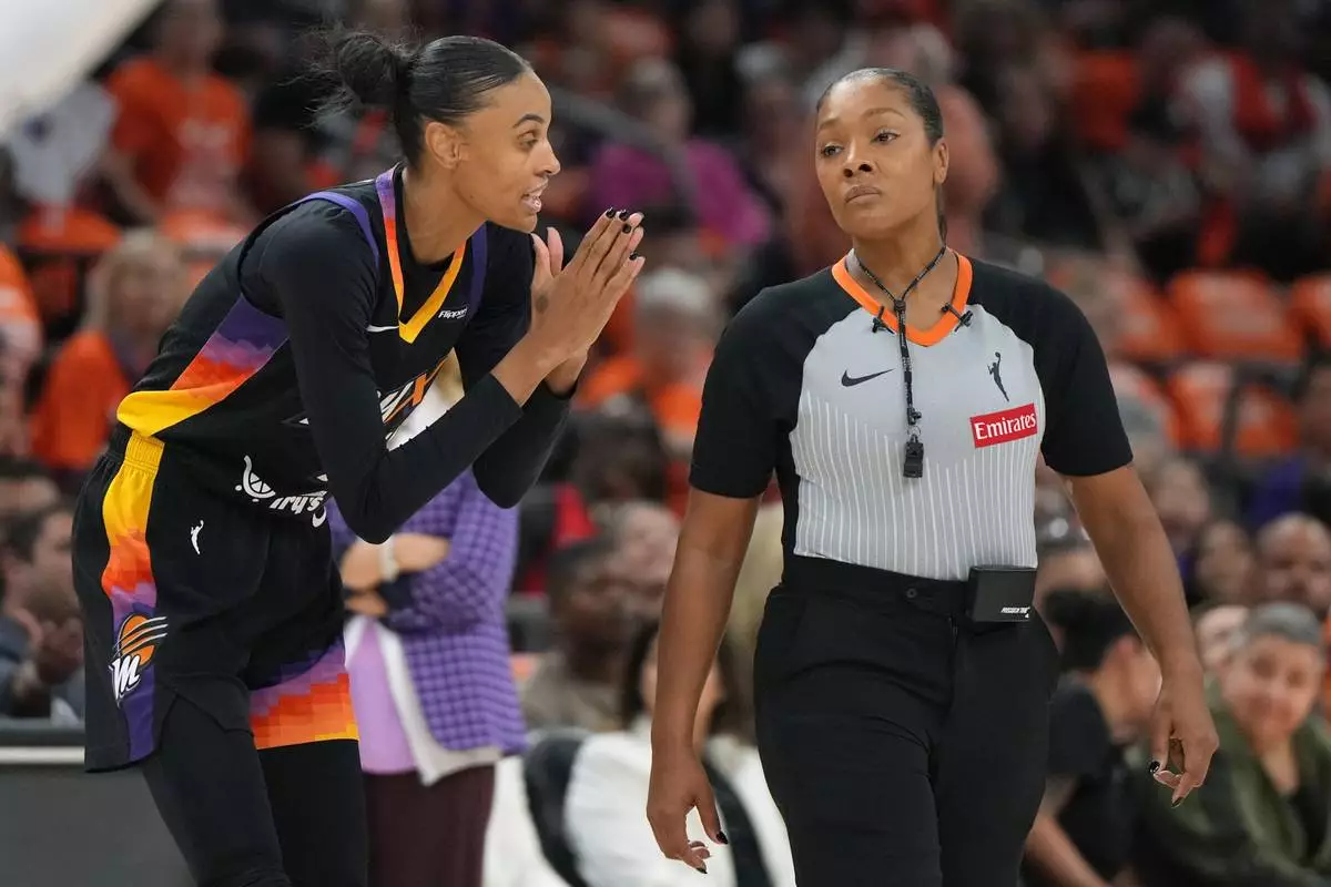 Phoenix Mercury forward DeWanna Bonner (14) talks to WNBA official Fatou Cissoko-Stephens during the first half of Game 3 of the WNBA basketball finals against the Las Vegas Aces, Wednesday, Oct. 8, 2025, in Phoenix. (AP Photo/Rick Scuteri)