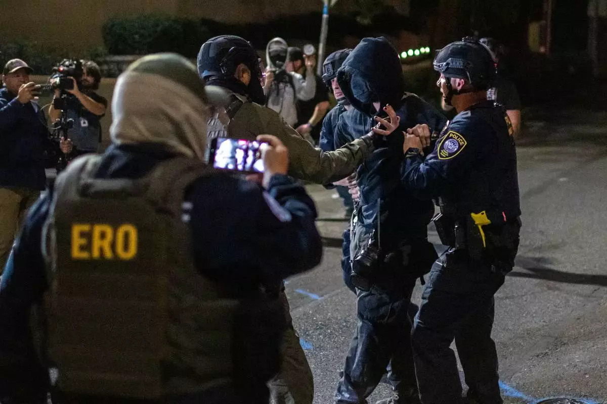 A protester is arrested by police and federal officers outside a U.S. Immigration and Customs Enforcement facility in Portland, Ore., Monday, Oct. 6, 2025. (AP Photo/Ethan Swope)