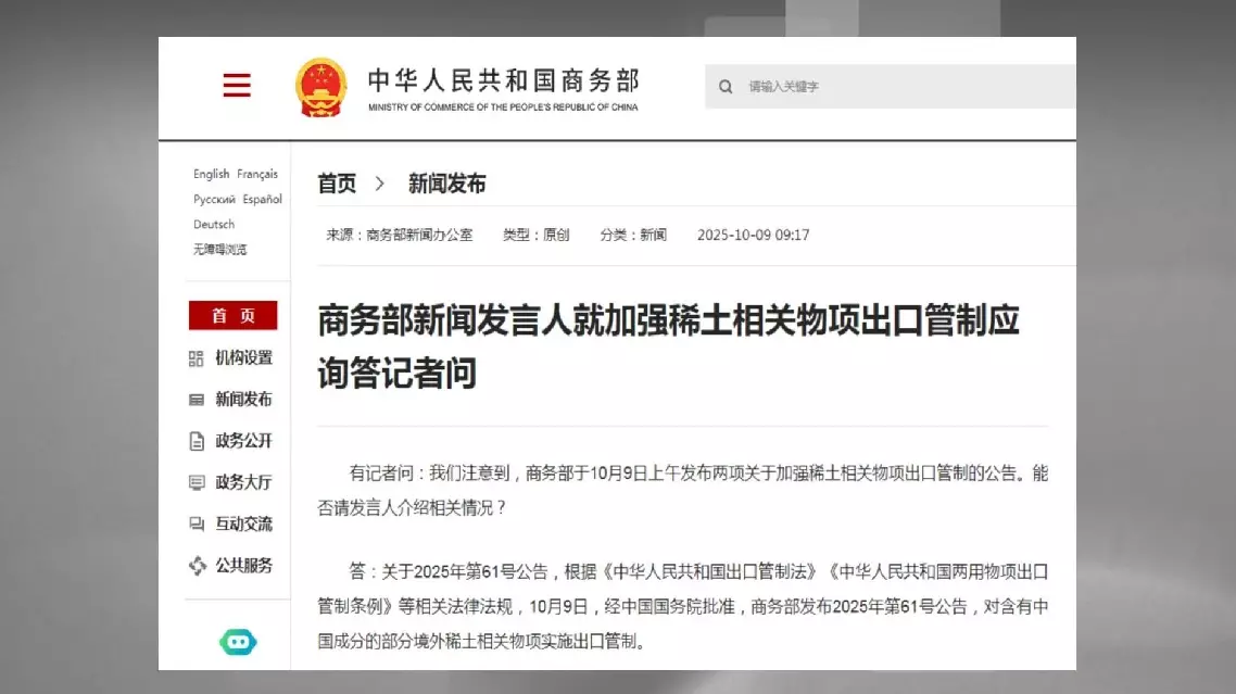 China's commerce ministry announced on Thursday that it would impose export control measures on technologies related to rare earths, with immediate effect.