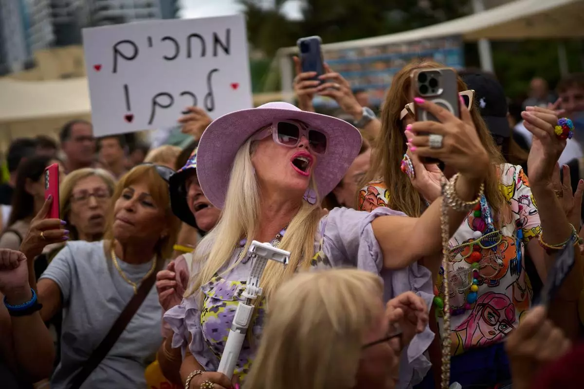 Einav Zangauker, center, mother of Matan Zangauker, who is being held hostage by Hamas, celebrates along with other families and supporters of Israeli hostages after the announcement that Israel and Hamas have agreed to the first phase of a peace plan, as they gather at a plaza known as the hostages square in Tel Aviv, Israel, Thursday, Oct. 9, 2025. (AP Photo/Ohad Zwigenberg)